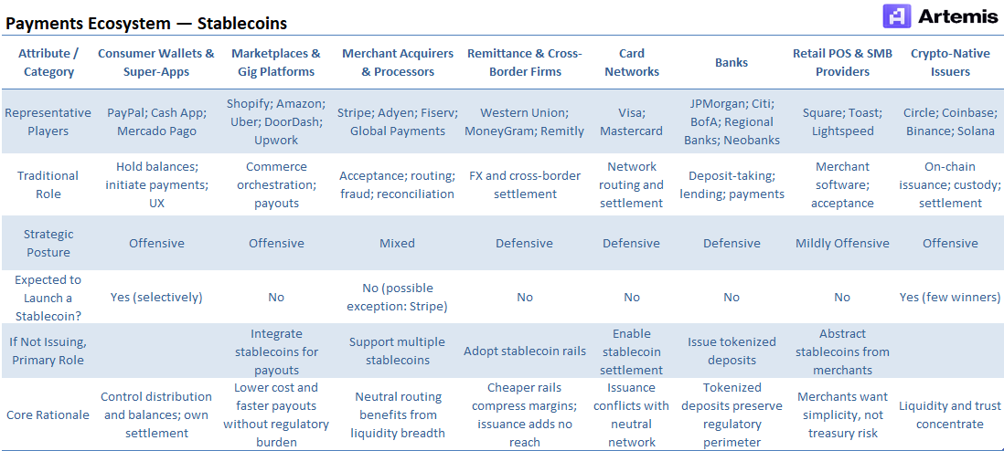 Many large platforms operate with extremely thin transaction margins. If stablecoins allow a platform to bypass even 1-3 basis points of cost on a portion of flows, the savings are material. At $1 trillion of TPV, 1 bp of cost reduction is worth $100 million. Offensive companies mainly encompass fintech native, capital-light payment rails like Paypal, Stripe, and Cash App.