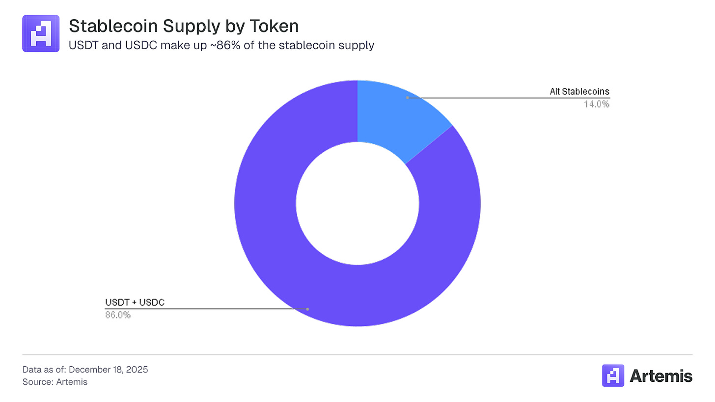 As of December 2025, USDT’s dominance of total stablecoin supply stands at 60%, with second place USDC clocking in at 26%. This means alternatives control approximately 14% of the $310B pie. While $43B this doesn’t sound like a lot compared to the multi-trillion equity or fixed income markets, overall stablecoin supply has grown 11.5x from $26.9B in January 2021, representing a 63% CAGR over the last five years.