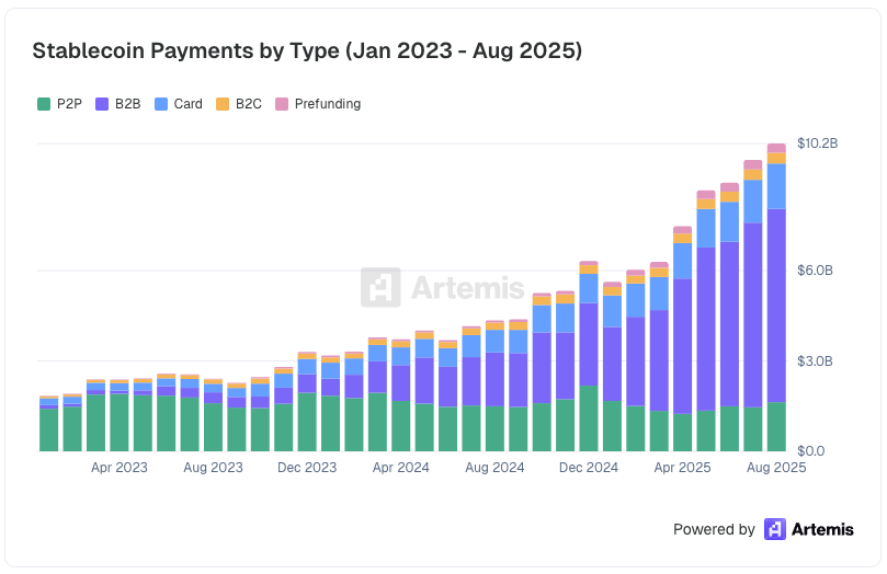 As of Artemis’ latest survey in August 2025, merchants are already processing $6.4B in B2B stablecoin payments, 10x what they were processing in December 2023.