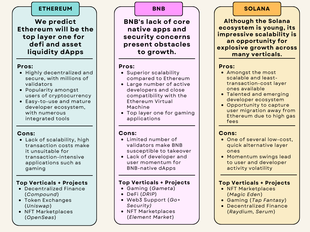 We are beginning to see application specific verticals develop across monolithic chains. While Ethereum’s decentralization and security encouraged development of DeFi and token liquidity applications, BNB’s speed and consumer-friendly presence has allowed it to develop as a retail gaming chain. Solana’s highly scalable, low transaction fee environment has led to a booming NFT ecosystem alongside increasing adoption of decentralized finance and gaming.