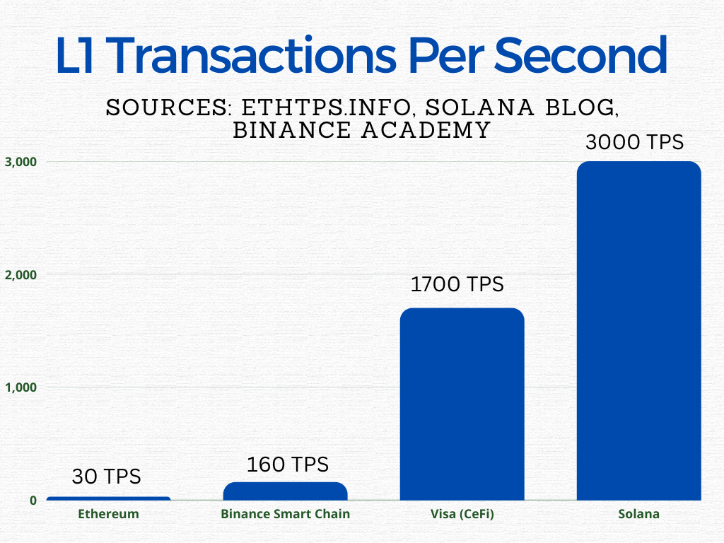 A measure of a blockchain’s transactions per second shows the chain’s ability to sustain and process a large number of transactions rapidly. Traditional payment processing infrastructure, like that of credit card company Visa, can handle about 1,700 tps. Ethereum, known for its low transactions per second, handles around 30 tps. BNB is more scalable, handling around 160 tps. Solana is impressively scalable, handling around 3,000 tps.