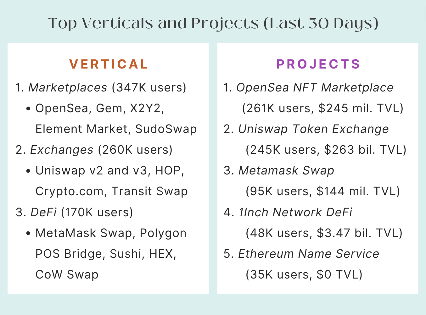 Ethereum’s top dApps fulfill vital functions in facilitating the exchange of tokenized assets. For example, OpenSea and Uniswap, perhaps the largest NFT marketplace and decentralized exchange, respectively, are built on top of Ethereum. These projects enable the primary current functionality of crypto assets, which is the acquisition or exchange into different tokens or assets. Additionally on Ethereum, there are a number of DeFi projects that, in its simplest form, allow investors to stake tokens and generate rewards.