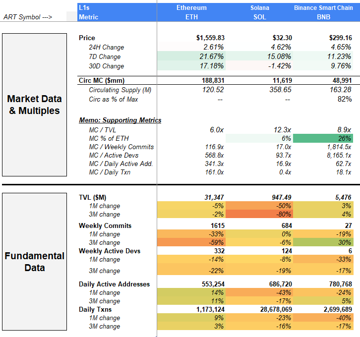 Ethereum, BNB, and Solana pricing information and fundamental valuation multiples, taken from artemis.xyz. Solana is trading at significantly higher multiples than Ethereum or BNB, but has remarkably strong developer activity and thus potential development momentum.