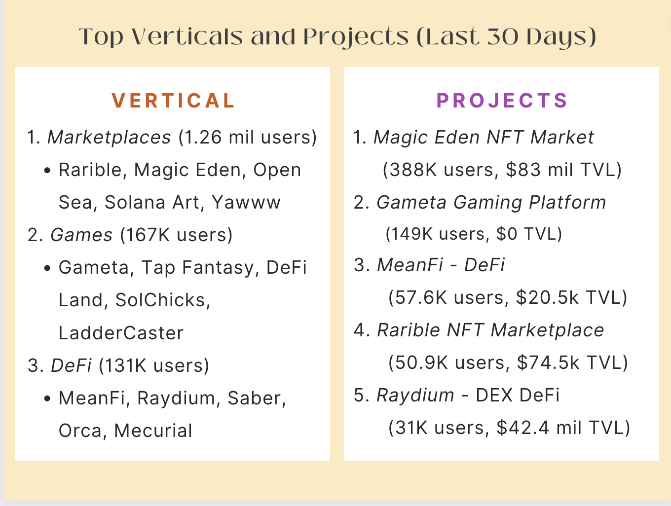 Ultimately, the dApp landscape on Solana is still emerging. Much like Ethereum, marketplaces and defi are two primary categories of dApps. So, why marketplaces and defi? Solana’s user base and TVL is significantly lower than Ethereum’s, but growing rapidly. The steady influx of users is often due to complaints about high transaction costs - with Solana a cheap, fast, and secure alternative. Many of Solana’s most popular marketplaces were developed to support cheap NFT trading, and have actually developed better multi-chain compatibility in the process.