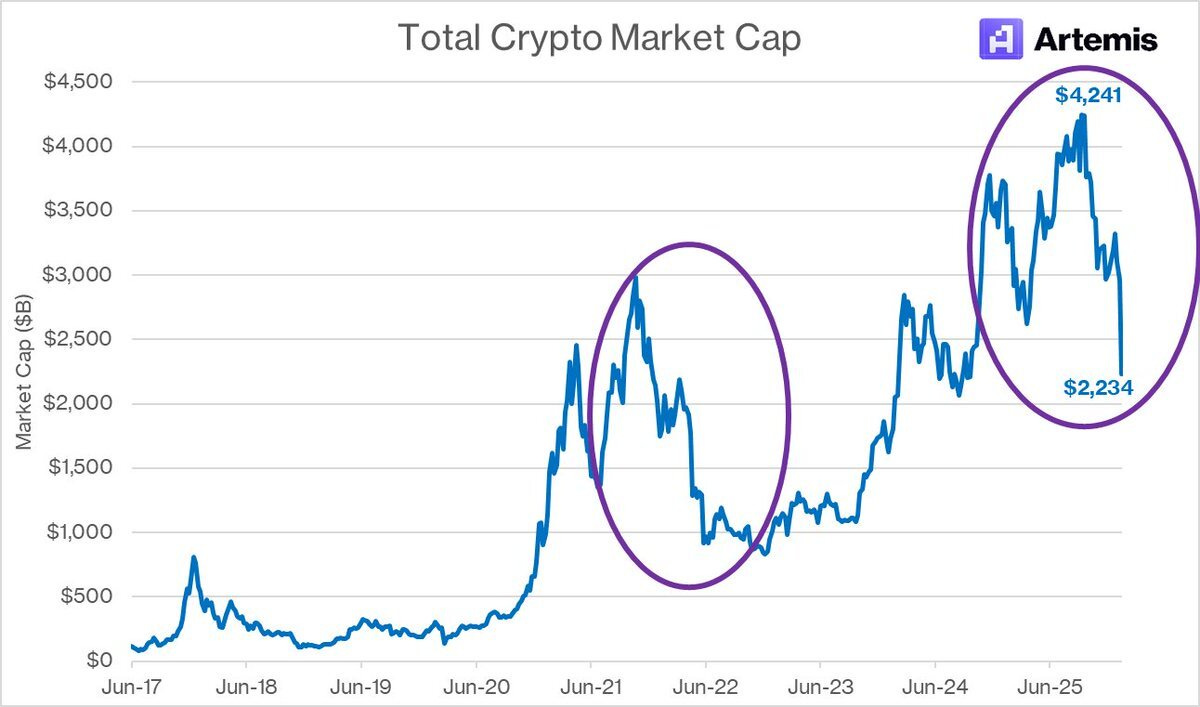 Main Street, allocated to index funds and fixed income, is chilling while growth chasers still accumulating for retirement (aka Millennials and Gen Z) are suffering. The crypto winter in 2022 sucked but everything was down; Meta had a larger peak to trough (-77%) than broader crypto (-75%). Cutting rates as inflation retreated was the tide that rose all ships. Now, crypto is staring at a -50% drawdown and record $2 trillion wiped off its market cap while inflation is low and the FOMC has cut rates 7 times.