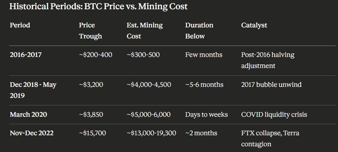 What is the floor for crypto? Well, history has shown that Bitcoin usually troughs right below mining costs, and can hang there for a while before retracing higher. The reason for this is simple - once all-in costs exceed spot Bitcoin prices, it doesn’t make any sense for miners to continue powering costly rigs to mine more Bitcoin. Turning off the taps thus leads to slower supply growth, and becomes an Econ 101 supply and demand story.