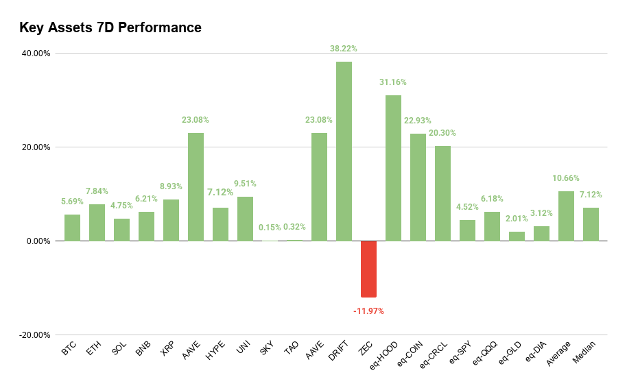 Assets across digital finance returned an average of 10.66%, led by AAVE, DRIFT, HOOD, COIN and CIRCLE, each of which returned above 20%. Crypto majors BTC, ETC and SOL returned about 5% each.