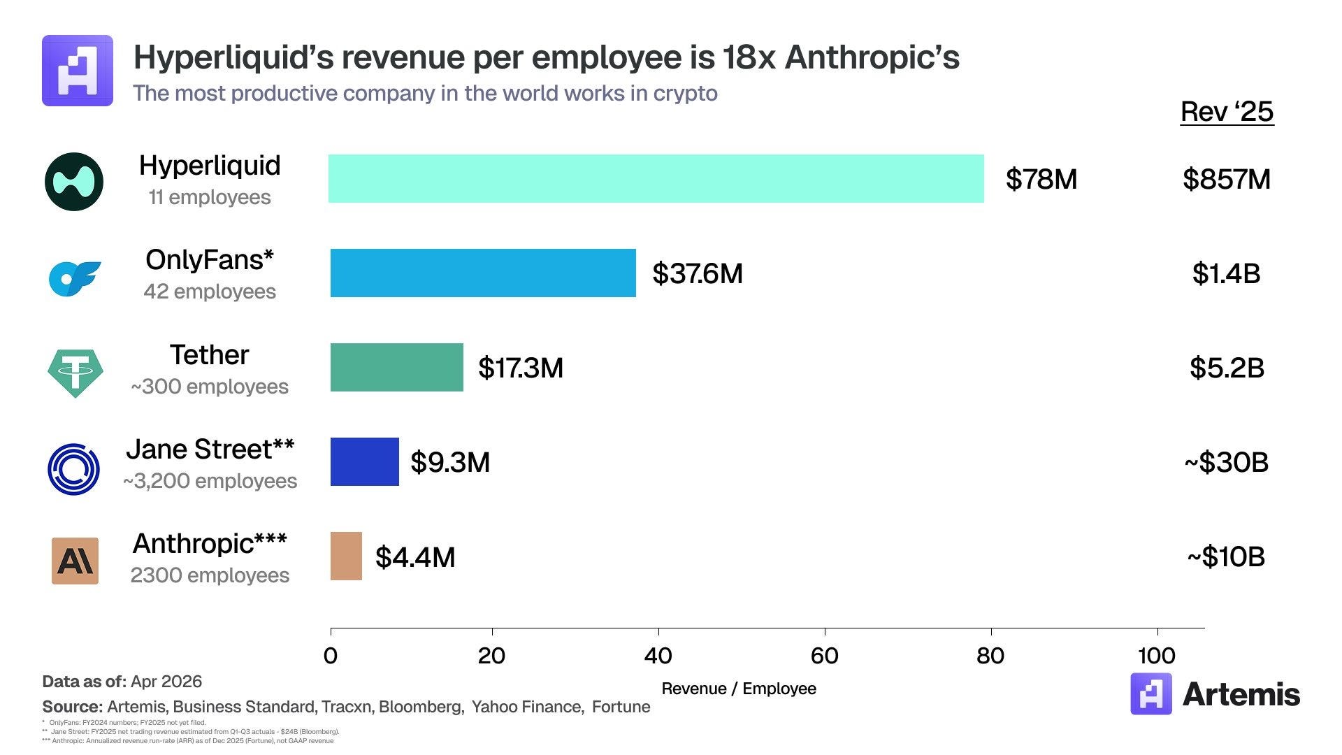 The framing: most DAT vehicles wrap an asset that either earns nothing (BTC) or runs at a negative operational cash flow once staking emissions are netted against fees (ETH: $526M fees vs. $3,035M in emissions; SOL: $680M vs. $3,936M). Hyperliquid is the outlier. It generated $857M in 2025 fees (of which $797M from perps at a 2.72 bps take rate), with 99% of earnings flowing to the Assistance Fund for buyback-and-burn ($837M on $857M of fees). Staking emissions come from a pre-allocated reserve rather than fee revenue, which the piece argues is the right way to evaluate operational cash flow. On that basis, HYPE is the only major crypto asset with positive underlying unit economics. Per outstanding HYPE (477M), that works out to roughly $1.76 of earnings per token. Hyperliquid is also the highest revenue generating company in the world per employee: