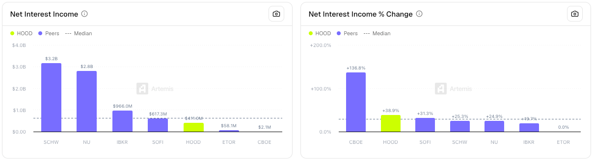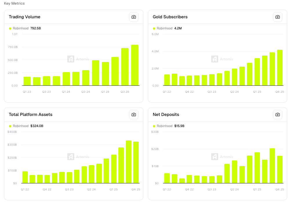 Robinhood saw record quarterly revenue in Q4 2025, growing at 26.5% YoY. Revenue growth was driven by strong net interest income growth. NII made up about 30% of Robinhood’s top line in Q4 2025, and grew 38.9% YoY.